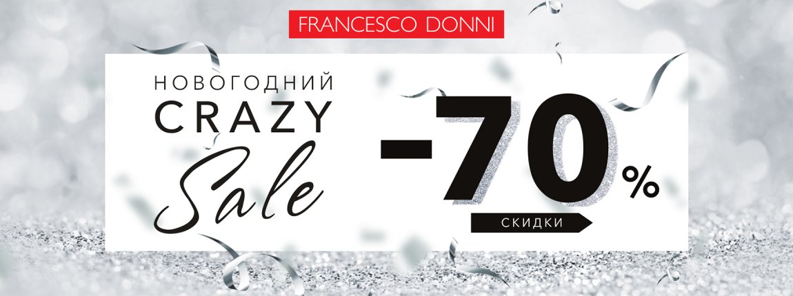 Во всех магазинах Francesco Donni стартовал Новогодний «Crazy Sale»! Скидка до 70%. «Crazy Sale» - прекрасный повод порадовать себя новинками со скидками до 70%. Позвольте себе больше поводов для улыбки и хорошего настроения. Приятных покупок и отличного настроения.