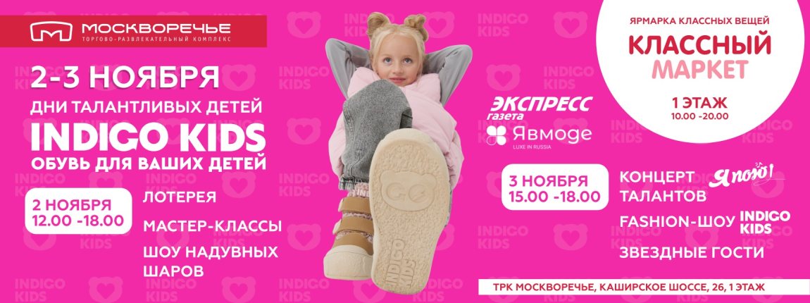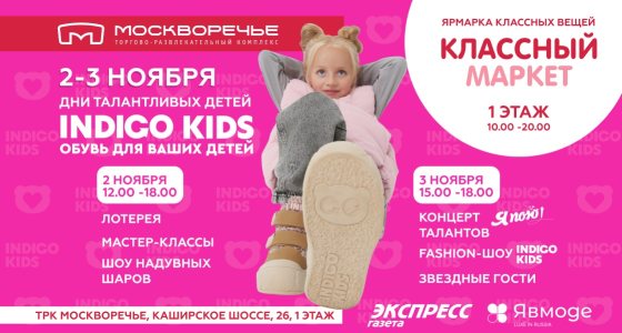 Приготовьтесь к самому яркому семейному уик-энду осени! 2 и 3 ноября ТРК «Москворечье» совместно с брендом детской обуви INDIGO KIDS откроет свои двери для всех, кто верит в таланты своих детей и любит веселиться по-крупному! Вас ждут незабываемые «Дни талантливых детей» – в эти два дня ТРК «Москворечье» превратится в настоящую фабрику звёзд, где каждый маленький гость сможет почувствовать себя настоящей знаменитостью, а родители – насладиться моментом и выиграть приятный бонус!