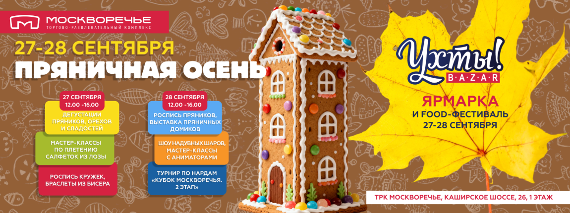 В эти выходные мы снова ждем гостей «Москворечья» на семейном празднике «Пряничная осень» и нашем осеннем маркете «УХТЫ!Bazar»! Встречаем золотую осень вместе с талантливыми мастерами ручной работы Москвы и Подмосковья и отмечаем День пряника, который в нашей стране празднуют 28 сентября!