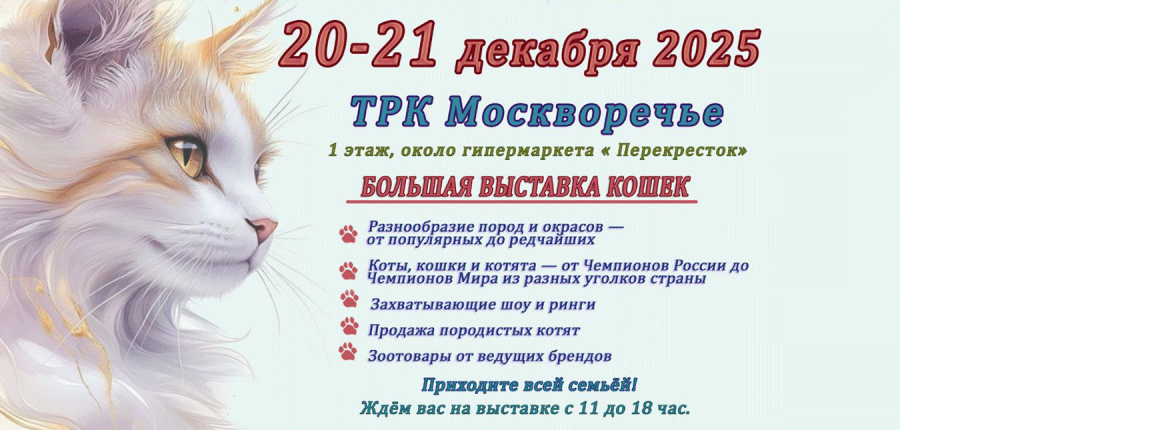 Приглашаем вас на удивительную выставку кошек «Снежная ФРЕерия», где вы сможете увидеть разнообразие пород и окрасов — от популярных до редчайших! Приготовьтесь к множеству положительных эмоций и тепла, ведь на нашей выставке вас ждут самые очаровательные и грациозные представители различных пород.