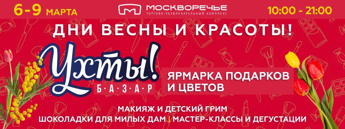 С 6 по 9 марта ТРК «Москворечье» приглашает на праздничные мероприятия, посвященные Международному женскому дню! Все 4 дня для Вас будут ждать на ярмарке красивых вещей и ручной работы УХТЫ! Базар, где вы сможете приобрести самые лучшие креативные подарки к празднику 8 марта: украшения, шоколад ручной работы, игрушки, парфюмерию и свечки и, конечно, цветы.