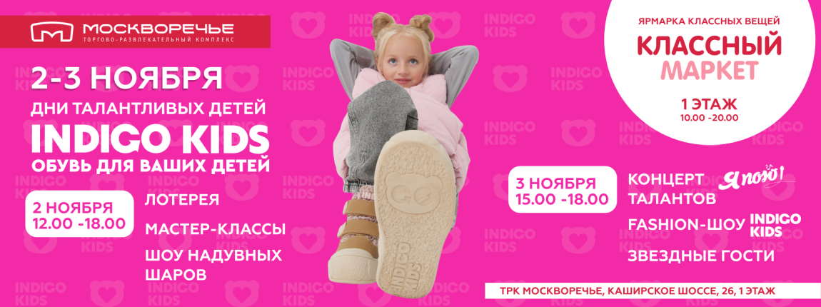 Приготовьтесь к самому яркому семейному уик-энду осени! 2 и 3 ноября ТРК «Москворечье» совместно с брендом детской обуви INDIGO KIDS откроет свои двери для всех, кто верит в таланты своих детей и любит веселиться по-крупному! Вас ждут незабываемые «Дни талантливых детей» – в эти два дня ТРК «Москворечье» превратится в настоящую фабрику звёзд, где каждый маленький гость сможет почувствовать себя настоящей знаменитостью, а родители – насладиться моментом и выиграть приятный бонус!